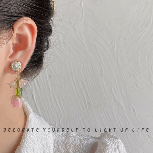 C廠【1229】森系超仙唯美手工藝鬱金香粉紅耳環小眾設計感立體花朵山茶花耳飾女 24.03-3