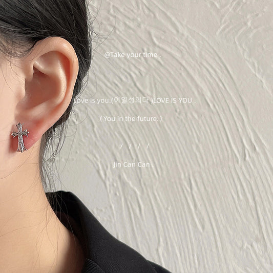 C廠【1226】個性龐克風微鑲鋯石十字架迷你耳環設計感街頭時尚辣妹風小眾耳飾 24.04-2