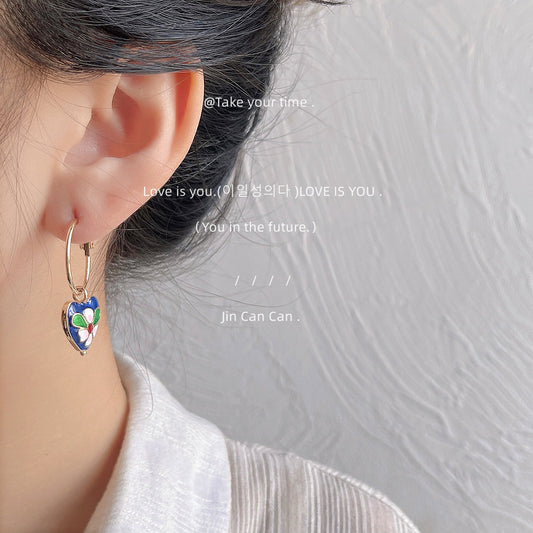 C廠【1242】景泰藍質感高級感宮廷風愛心不對稱耳扣淡水珍珠優雅民族風耳飾女 24.03-4