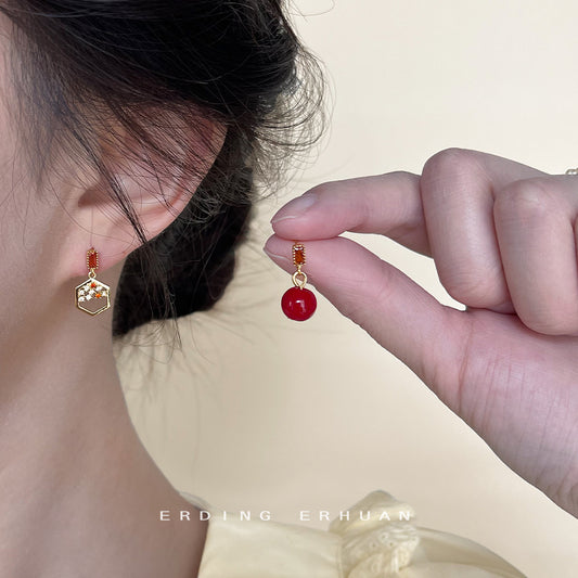 C廠【1259】中國風高級感不對稱紅色珍珠氣質耳環新中式微鑲鋯石鏤空幾何耳飾 24.05-4