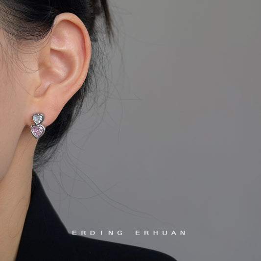 C廠【2815】百搭甜酷風微鑲鋯石彩色愛心耳環甜美不對稱設計感日韓心形耳飾女 24.07-2