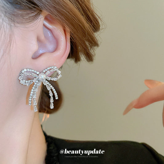 A廠【HE22100】925銀針滿鑽人造珍珠款蝴蝶結耳環ins風甜酷耳環氛圍感氣質時尚耳環 24.08-4