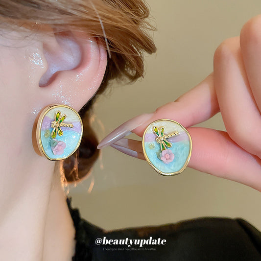 A廠【HE22083】925銀針油畫風滴油花朵蜻蜓耳環甜美創意設計耳環法式文藝氛圍感耳環 24.08-4
