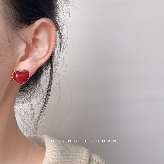 C廠【3562】氣質優雅紅色心形鍍14K霧面銀針愛心耳環時尚通勤復古耳飾 24.01-1