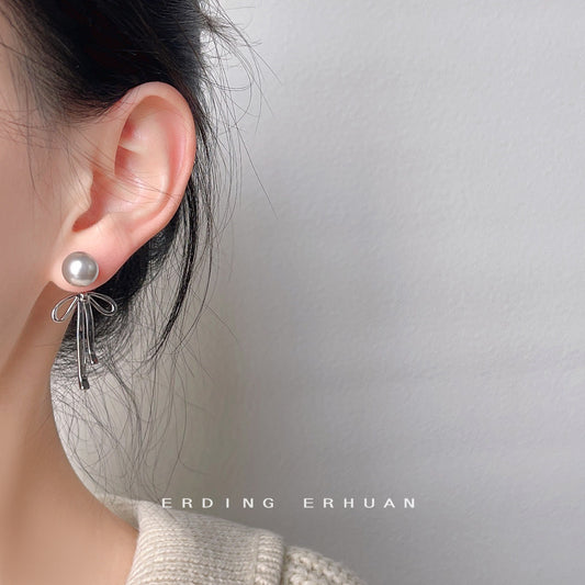 C廠【3561】施家珍珠品質真多麻灰一款兩戴蝴蝶結銀針耳環 24.01-2