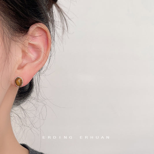 C廠【3545】文藝復古虎眼石迷你版橢圓形鵝蛋小耳環時尚百搭氣質鍍14K耳環 24.01-1