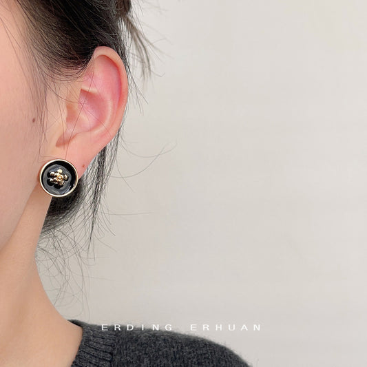 C廠【3542】文藝復古赫本風黑色滴釉山茶花小香耳環鍍14K時尚百搭耳環女耳環 24.01-1