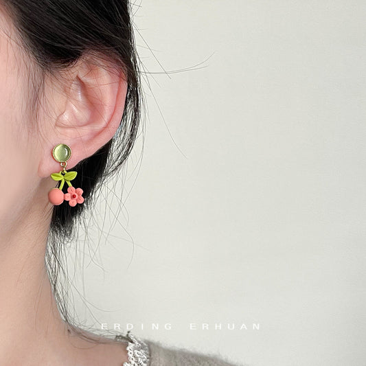 C廠【3650】森系小清新可愛甜美烤漆玻璃貓眼石花朵櫻桃氣質優雅耳飾 24.03-2