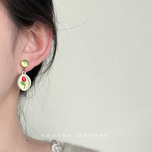 C廠【3673-3674】春夏款鬱金香玻璃貓眼石烤漆質感森繫甜美清新耳環 24.03-2