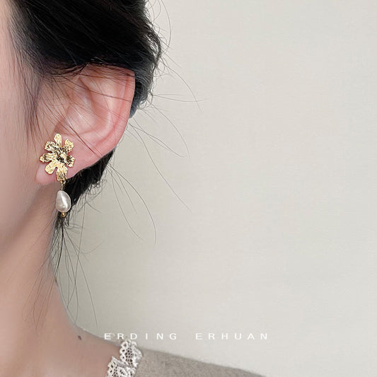 C廠【3685】法式復古巴洛克異形淡水珍珠不對稱設計花朵銀針耳飾 24.03-2