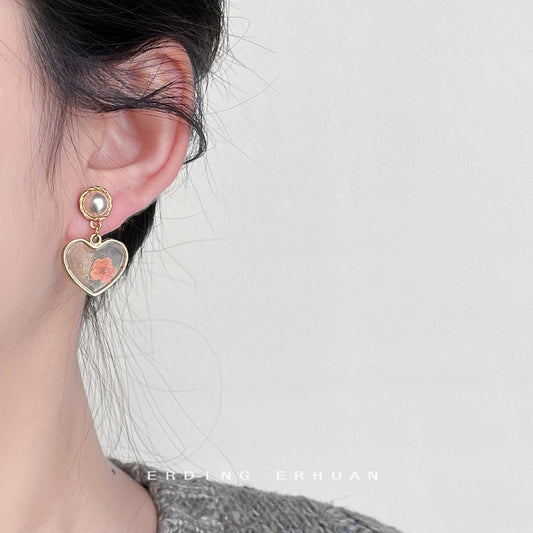C廠【3697】森系小清新真乾花滴油透明質感心形手工甜美耳飾鍍14K耳環女 24.04-1