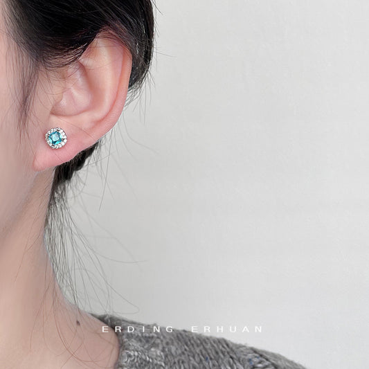 C廠【3723】微鑲鋯石簡約海藍色心幾何銀針耳環時尚通勤百搭耳飾 24.03-3