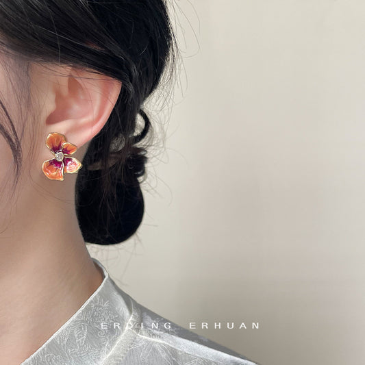 C廠【3965】法式復古鳶尾花琺瑯滴釉質感氣質優雅高級感鍍14K新款耳飾女耳環 24.05-3