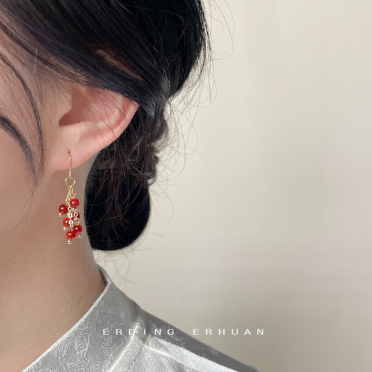 C廠【3956】紅瑪瑙原創設計師款小流蘇新中式耳環女個性復古耳環 24.11-2