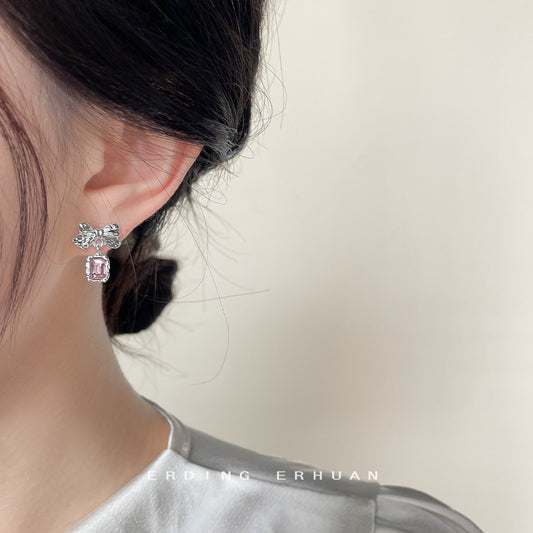 C廠【3958】粉紅色玻璃水晶甜美小清新蝴蝶結銀針耳飾氣質簡約通勤個性ins耳環 24.05-1