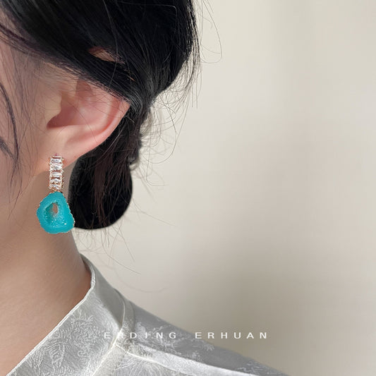 C廠【3963】高級感設計師款暈染色樹脂湖水藍鍍14K銀針氣質街拍耳飾 24.05-1