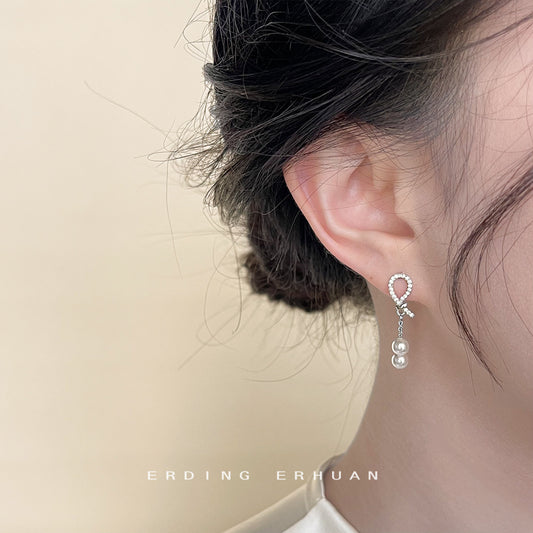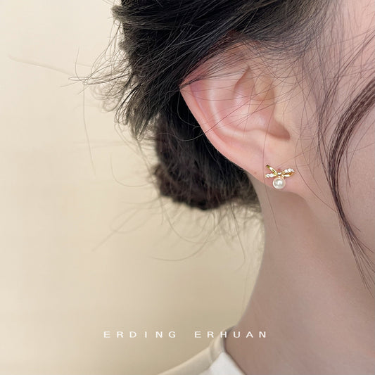 C廠【4135】微鑲鋯石迷你版蝴蝶結珍珠小耳環日常通勤百搭小巧鍍14K耳飾 24.06-1