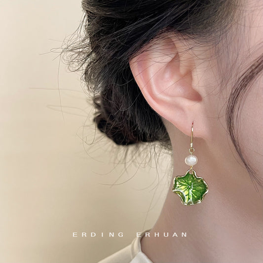 C廠【4137】新中式~淡水珍珠荷葉手工設計感耳環女鍍14K滴釉琺瑯質感耳飾 24.05-4