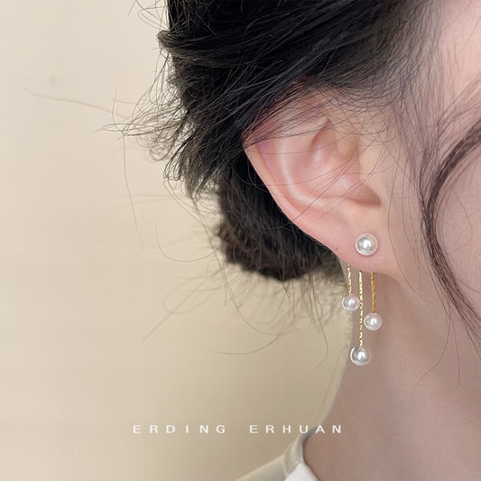 C廠【4140】前後戴~珍珠流蘇氣質時尚設計感簡約通勤長版鍍14K銀針耳飾女耳環 24.05-5