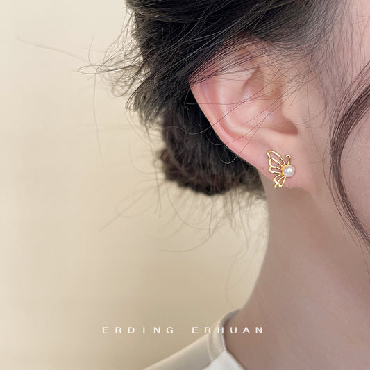 C廠【4143】時尚通勤高級感簡約風鏤空小巧蝴蝶電鍍14K珍珠耳環氣質耳飾 24.06-1