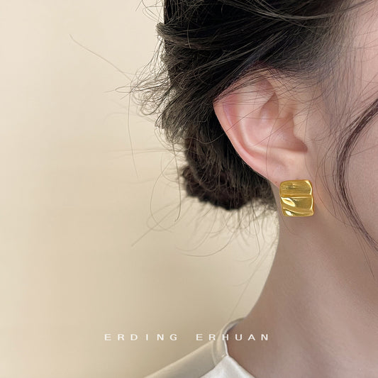 C廠【4122】高級感拉絲面幾何褶皺曲面方形鍍14K耳環女時尚通勤耳飾 24.05-5