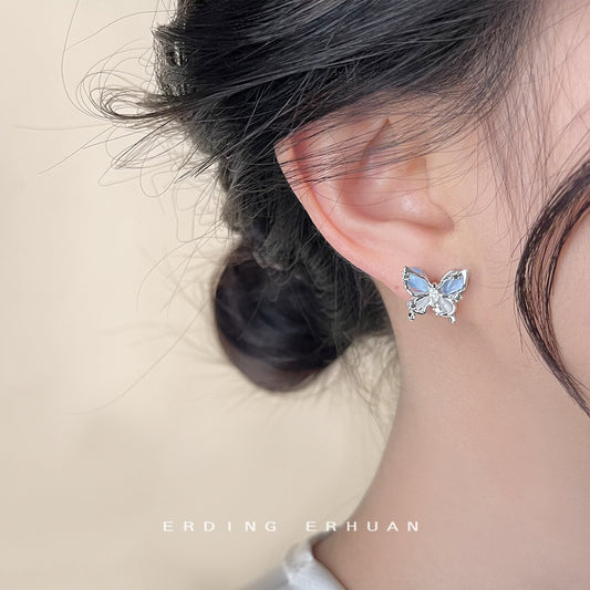 C廠【4226】夏日新款微鑲鋯石藍色玻璃貓眼石立體蝴蝶耳環2024個性甜酷風耳飾 24.06-2
