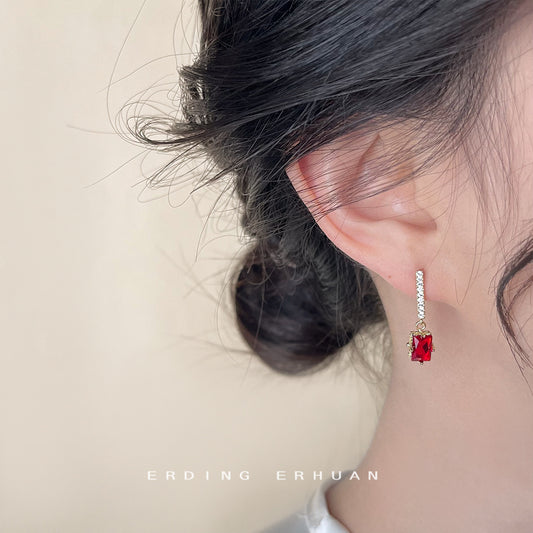C廠【4235】法式文藝復古微鑲鋯石鍍14K酒紅色方形幾何耳飾氣質簡約耳環 24.07-1