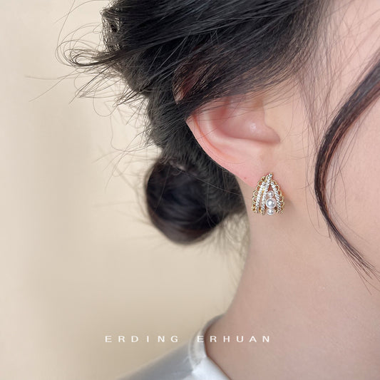 C廠【4246】微鑲鋯石鍍14K法式優雅鏤空蕾絲花邊幾何水滴珍珠耳飾 24.06-3