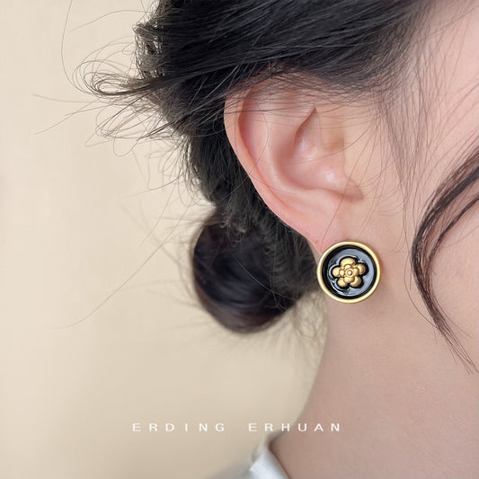 C廠【4236】小香風霧面黑色滴釉茶花耳環氣質優雅通勤百搭配飾耳環耳飾女 24.06-2