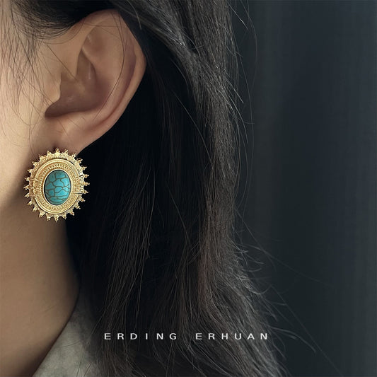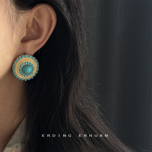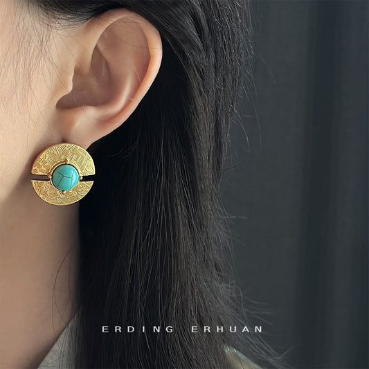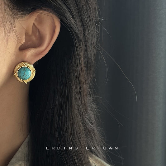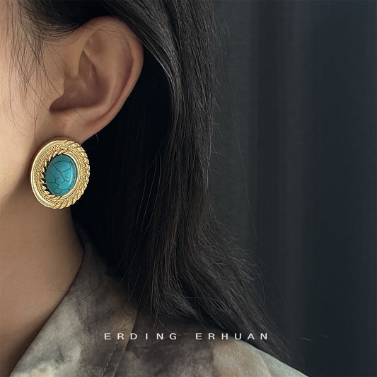 C廠【4310】文藝復古合成綠松石圓形幾何重工中古風新款耳環簡約耳飾 24.07-4
