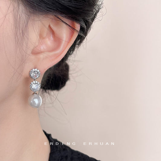 C廠【4302】晚宴風微鑲鋯石長款幾何圓形施家玻璃珍珠耳飾高級感輕奢耳環 24.06-2