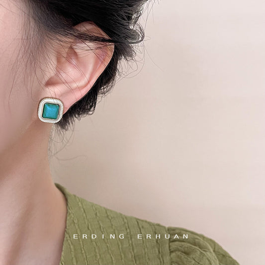 C廠【4309】復古宮廷簡約方形幾何滴油合成綠松石通勤耳環女文藝氣質耳飾 24.07-1