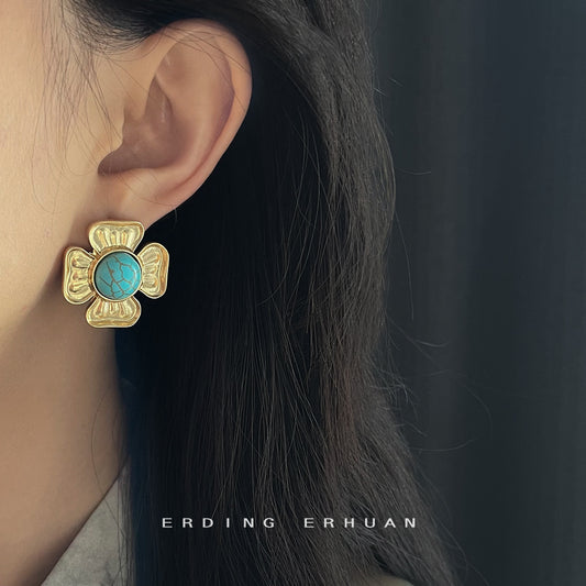 C廠【4311】法式復古合成綠松石文藝氣質中古重工質感霧面銀針耳飾女耳環耳環 24.06-4