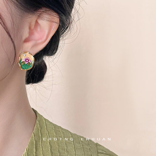 C廠【4398】新中式復古宮廷鍍14K琺瑯滴釉彩繪花朵耳環氣質優雅新款耳飾 24.06-4
