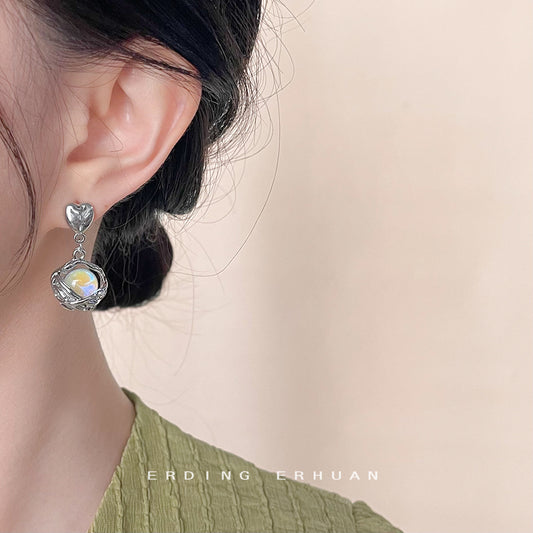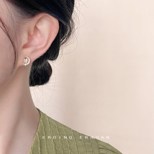 C廠【4408】微鑲鋯石玻璃貓眼石鍍14K月亮耳環簡約可愛小巧耳飾飾品 24.12-3