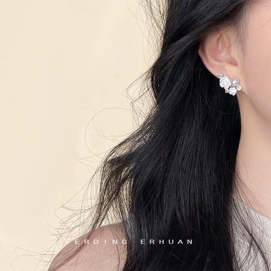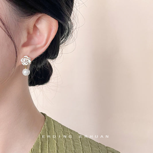 C廠【4392】微鑲鋯石琺瑯滴釉鍍14K簡約甜美通勤山茶花玻璃施家珍珠耳飾 24.07-1
