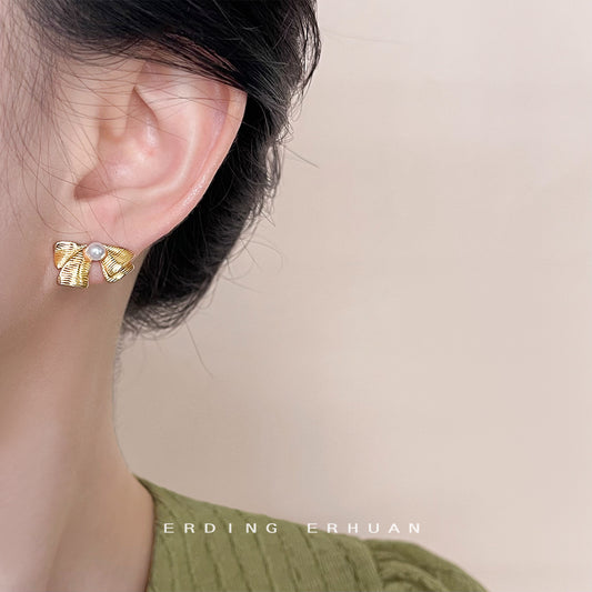 C廠【4525】時尚通勤鍍14K紋理感蝴蝶結耳環女氣質簡約耳環飾品 24.07-3
