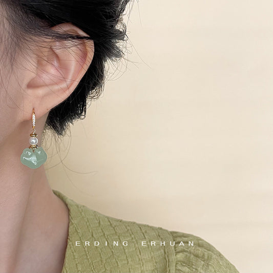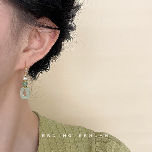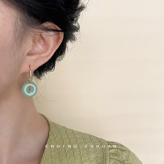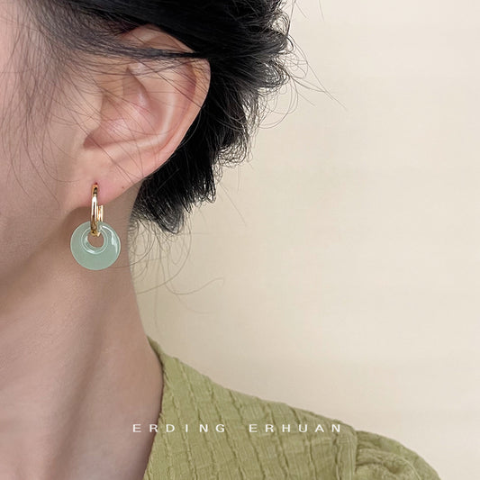 C廠【4516】新中式微鑲鋯石平安扣圓形幾何玻璃玉色耳環手工設計感國潮耳環女 24.08-1