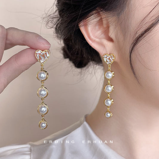 C廠【4521】升級版鍍18K真金加厚幾何長流蘇心型珍珠耳飾女神名媛耳環 24.07-2