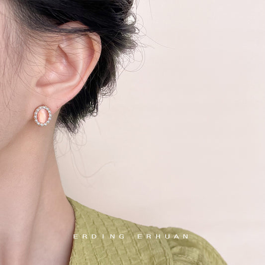 C廠【4507】法式復古玻璃貓眼石鍍14K橢圓幾何小巧通勤耳環新款耳環飾品 24.07-2