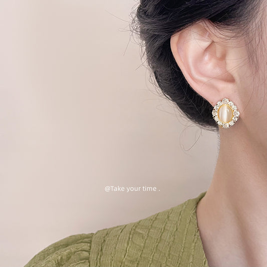 C廠【4686】時尚通勤高級感輕奢風法式玻璃貓眼石微鑲鋯石鍍14K簡約耳飾耳環 24.09-2