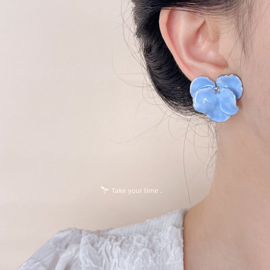 C廠【4681】鍍真白金優雅超仙森系寫真奶油嬰兒藍花朵耳環女氣質甜美耳環 24.08-4