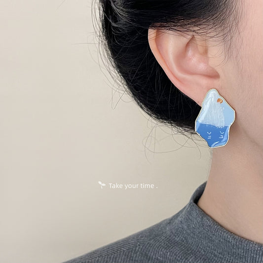 C廠【4676】原創設計~油畫感富士山下~手工滴油藝術生耳飾女氣質耳環耳環 24.08-2
