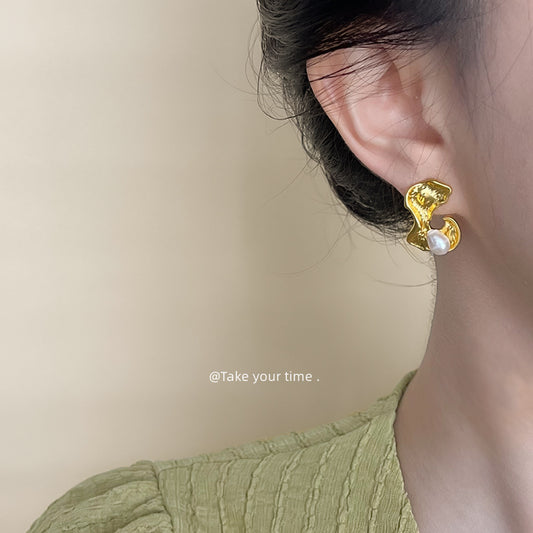 C廠【4745】淡水珍珠鍍14K霧面不規則異形設計師款高級感文藝復古耳飾女耳環 24.09-1