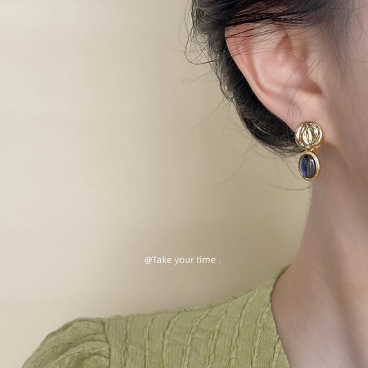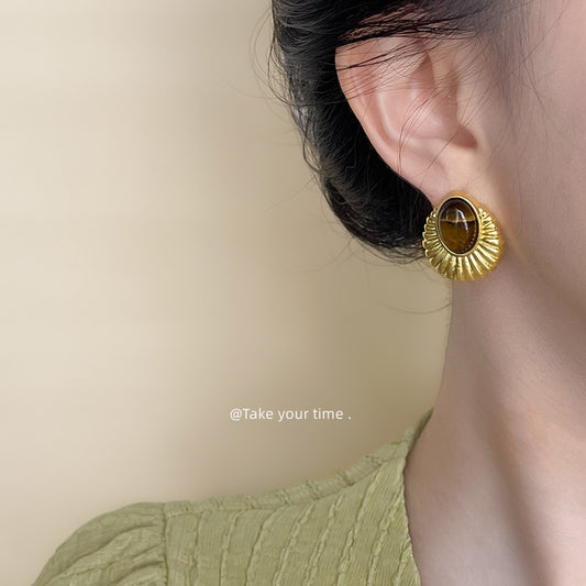 C廠【4742】中古天然石虎眼石民族風橢圓幾何鍍14K秋冬新款耳環耳飾耳環 24.10-1