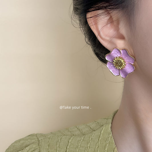 C廠【4747】Vintage中古風實物略大誇張女神駕馭琺瑯滴油花朵耳環女氣質耳飾 24.08-4