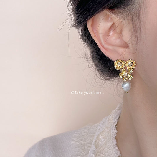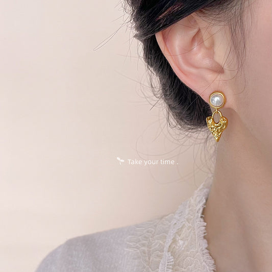C廠【4929】淡水珍珠肌理感鍍18K熔岩金屬愛心珍珠飾品 法式復古耳環耳環 24.09-4