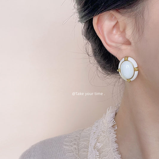 C廠【4928】文藝復古中古風橢圓幾何鍍14K重工質感滴油白色耳環耳飾耳環 24.09-4