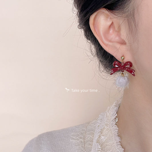 C廠【4921】安可拉紅2024冬天款酒紅色蝴蝶結毛球耳環復古甜美蝴蝶結耳環 24.09-4