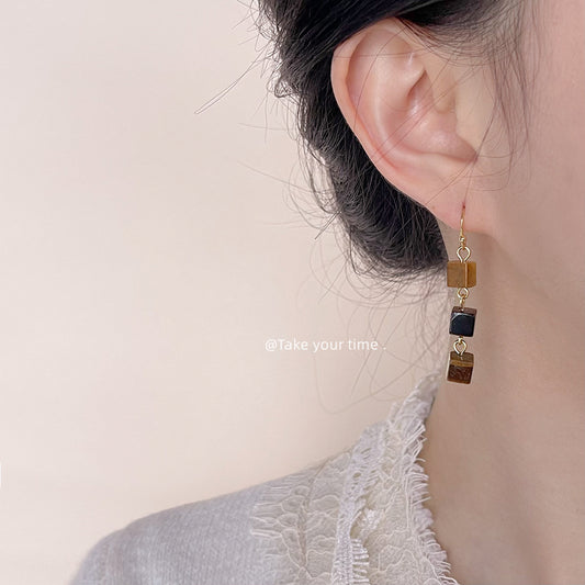 C廠【4906】原廠設計感天然石虎眼石方形幾何長款流蘇耳飾復古耳環女 24.10-2